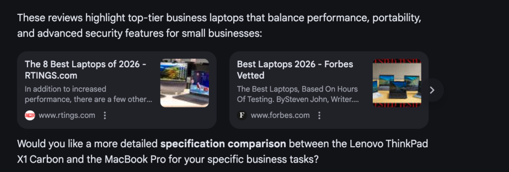 For laptop tasks, the dominant clarity problem was that price did not appear. Participants who wanted to check whether a model fit their budget had to leave AI Mode to do it.Several did not bother. The participant who said “it’s not giving me prices, this is not helpful” is a shortlist-abandonment risk: a participant who cannot quickly confirm a price will often fall back on brand familiarity rather than making an informed comparison.